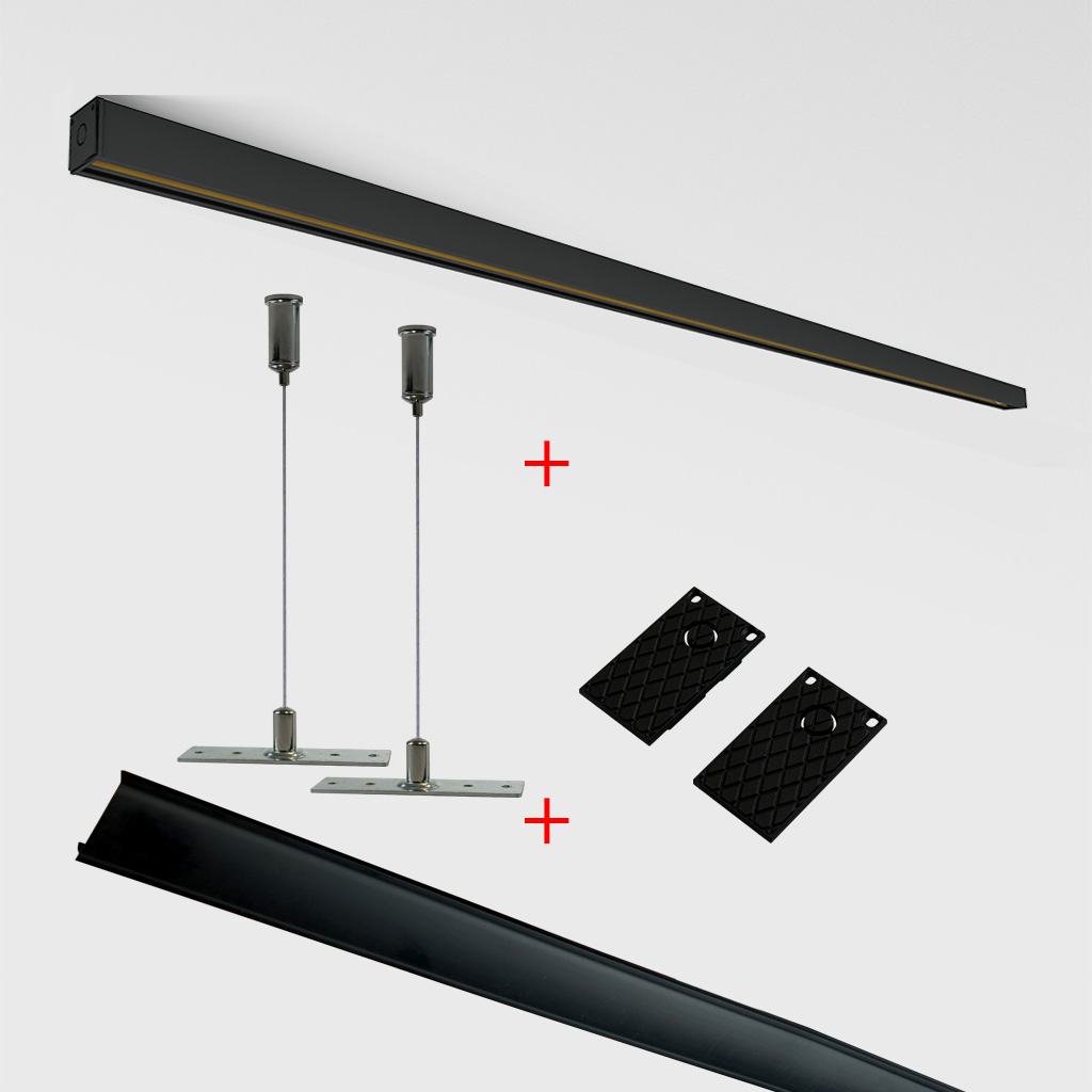 The magnetic slim track rails with SUSPENDED MOUNTING are part of an LED lighting system that uses a magnetic profile and is mounted directly on the surface of the ceiling. This magnetic profile allows the easy fixing and movement of the magnetic lighting fixtures thanks to the "click" type system, allowing their positioning and moving without having to turn off the energy power supply.