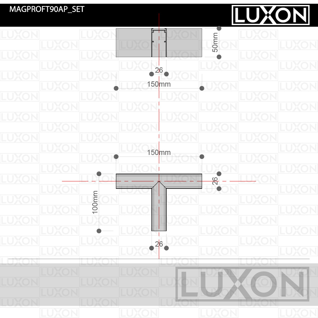 The white T-connector for magnetic tracks with SURFACE MOUNTING is designed to create a T-shaped joint at the intersection of three tracks. This connector is also compatible with magnetic tracks with SUSPENDED MOUNTING.